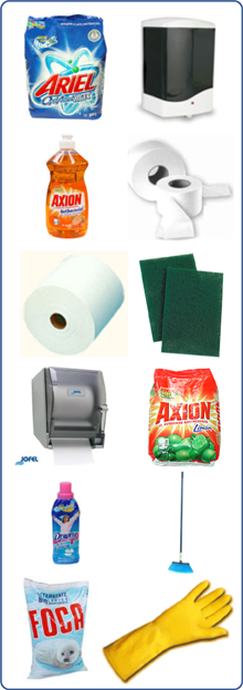 Contamos con productos químicos para limpieza y desinfección de pisos, desengrasantes para cocina y motores de todo tipo, shampoo antibacterial, gel para manos, guantes de látex, escobas de plástico, mechudos de algodón, aromatizantes, bolsas negras para basura, detergentes, papel higiénico jumbo jr., toallas interdobladas de papel, toallas en rollo, cloro, ácidos, material para cocinas, despachadores de papel, despachadores de toallas interdobladas, despachadores automáticos con sensor y manuales, cestos de basura, fibras verdes, pastillas para w/c. franelas, atomizadores, etc.